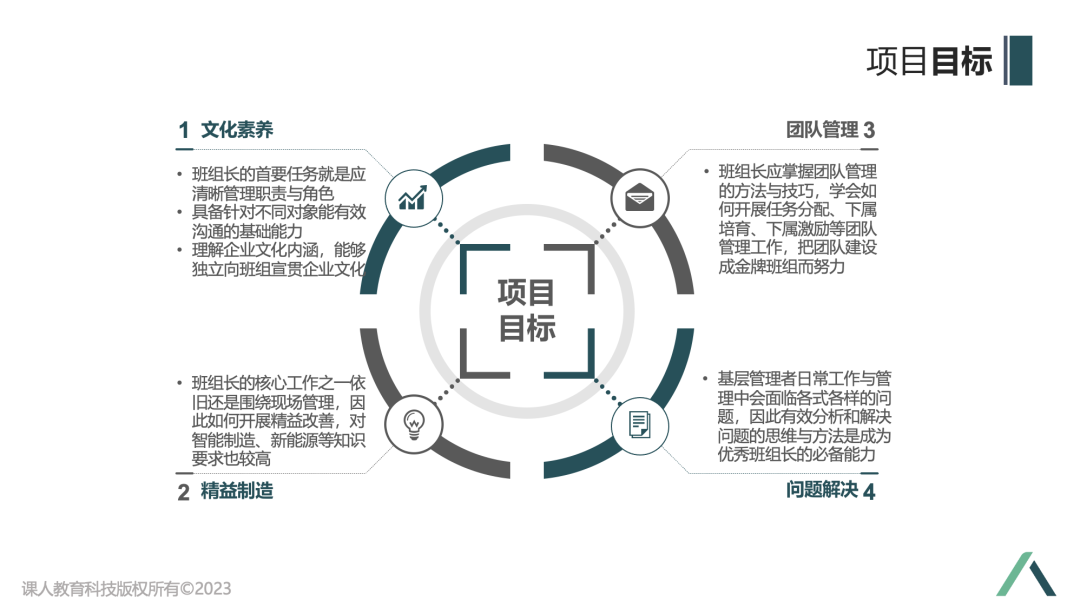 2023年是某大型车企与课人教育持续合作的第三年,通过前两年的磨合与改进,今年开展的卓越班组长孵化项目更加注重项目内容与过程产出,并希望在项目期间通过环节设计让学员持续参与和投入,确保项目切实提升班组长技能,为企业持续发展培育关键人才。项目前期课人与该企业协同开展了调研工作,针对学员群体以及学员上级进行了问卷调研,明确了今年卓越班组长孵化项目的核心目标: